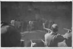 ልክ 5፡15 ሰዓት ገደማ ሲሆን አብራሃ ደቦጭና ሞገስ አስገዶም ከበረንዳው በላይ ባለው ፎቅ ላይ/ግራዚያኒ ከቆመበት ሥፍራ ላይ ጥቁር ሸሚዝ ለብሰው፣ ኩታቸውን ተከናንበው ታዩ። ዓይኖቻቸው በንቃት ይንተገተጋሉ። ሰዓቱ ፍጥነቱን ጠብቆ ተጓዘ። ልክ 5፡30 ሲሆን ለነዲያን ምጽዋት መሥጠት ተጀመረ። በሥፍራው ከሦስት ሺህ ሁለት መቶ (3,200) በላይ ነዲያን ነበሩ። እንዲሁም ግብር ሊበሉ የመጡ በርካታ የአዲስ አበባ ነዋሪዎችም ግራዚያኒና ግብረ አበሮቹ ከቆሙበት ስፍራ በአሥር ወይም አሥራ ሁለት ሜትር ርቀት ላይ ከበው ቆመው ነበር። ከሰዎቹም ፈንጠር ብለው ከዘጠና የማያንሱ መትረየሳቸውን የደገኑ ሶላቶዎችና አስካሪዎች በተጠንቀቅ ቆመዋል። ነዲያኑን ራቅ እንዲሉ ይገፋቸው ጀመር። ጫጫታና ውካታው ከፍ ብሎም ይሰማ ነበር። በዚህ ሁኔታ ለአሥር ደቂቃዎች ያህል ትርምስምሱ የወጣ ትዕይንት ይታይ ጀመር።
